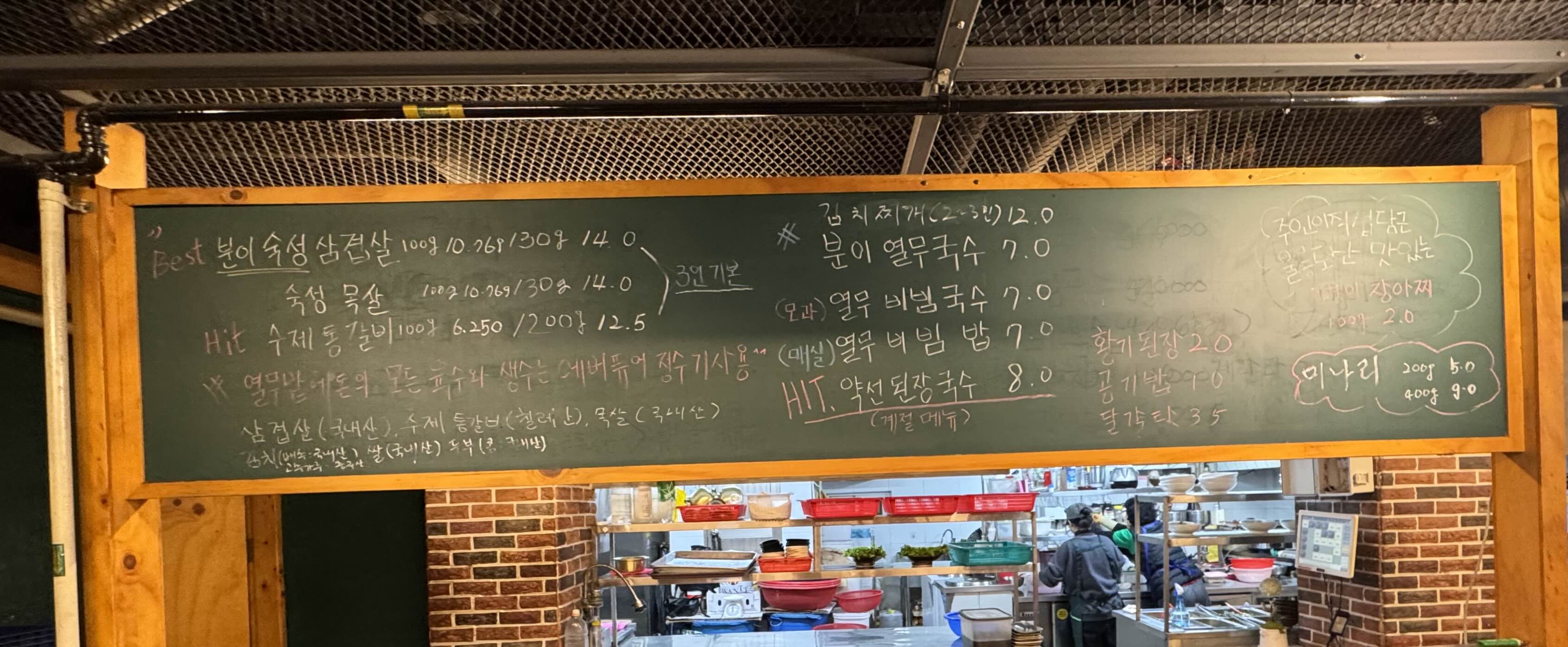메뉴판을 보면 모든 육수와 생수에 에버퓨어 정수기를 사용한다는 점이 눈에 띄고, 오픈형 주방을 통해 음식에 대한 자신감을 엿볼 수 있다.