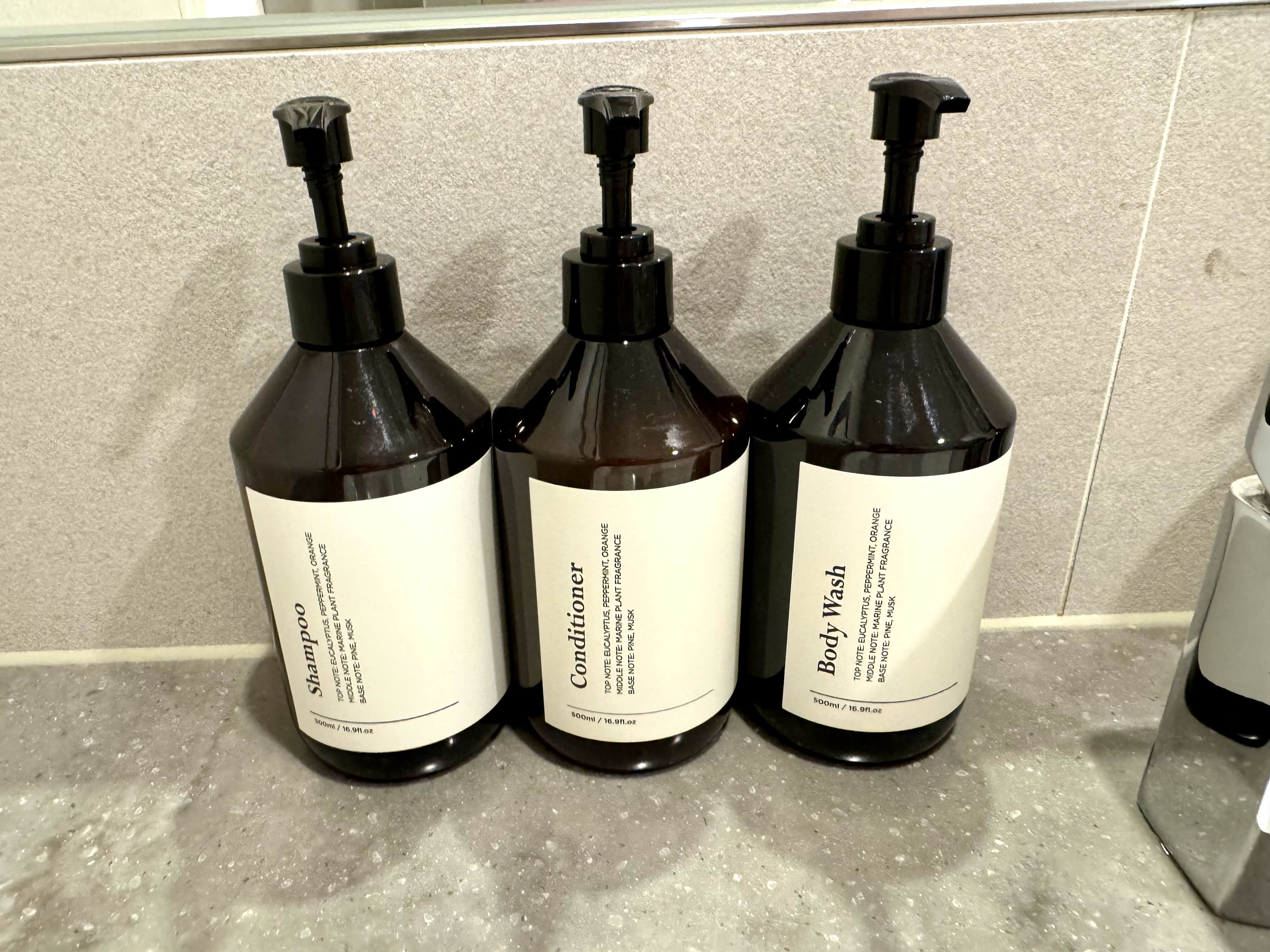 샴푸, 린스, 보디워시, 로션이 구비⭕️ 되어 있지만 환경 보호의 일회용 사용 문제로 치약, 칫솔은 제공되지 않는다❌